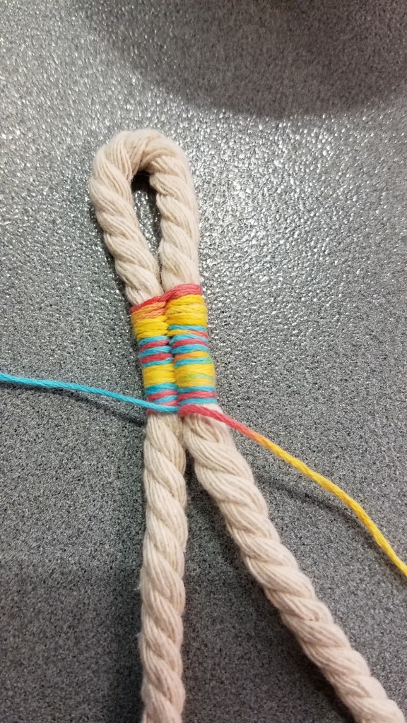 4) Continue to wrap the cord with embroidery floss. To switch colors, trim the previous color with a short tail (less than 1 inch), then create a small tail (also less than 1 inch) with the new color and start wrapping the new color as close to the last wrap of the previous floss color.