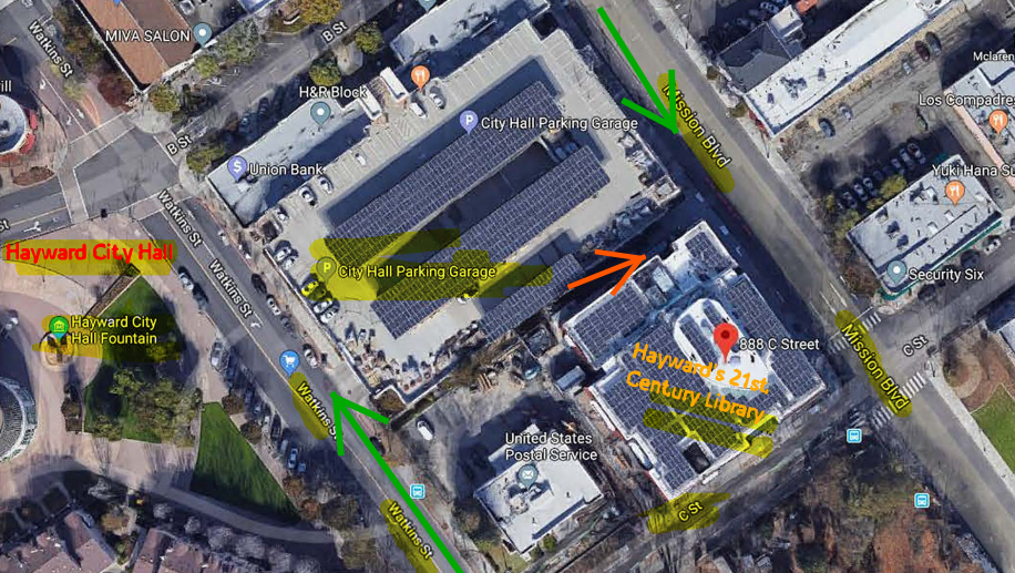 Public Transit: The library is 0.2 miles (approximately a 5 min walk) from the Hayward BART Station. There are several AC Transit bus lines that pick up/drop off near the library depending on where you are coming from.